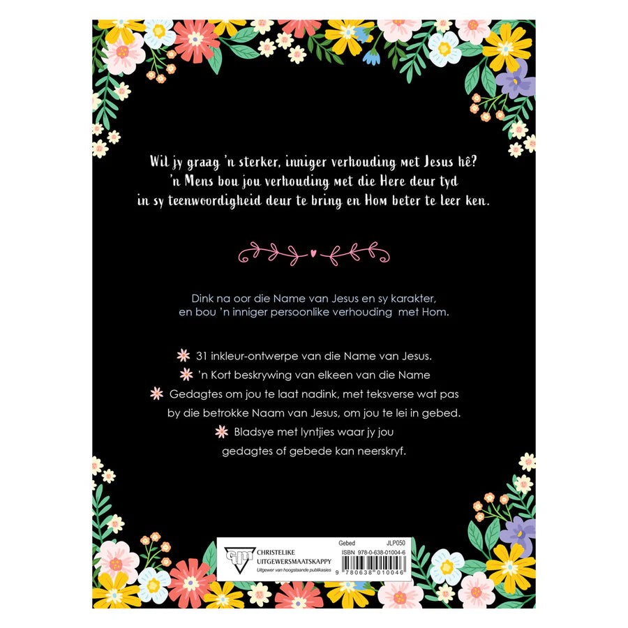 Die Name van Jesus Gebedsjoernaal sal jou help nadink oor die Name van Jesus en sy karakter en jou help om ’n inniger persoonlike verhouding met Hom te bou. Hierdie gebedsjoernaal bevat: