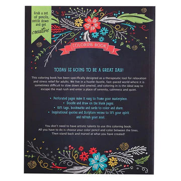 The cover of the Today is Going to be a Great Day Coloring Book is black, and the lettering is white. The design reminds one of an old fashioned chalkboard. The book is bound in heavy-duty stock and features 128 perforated pages with 62 images to color.