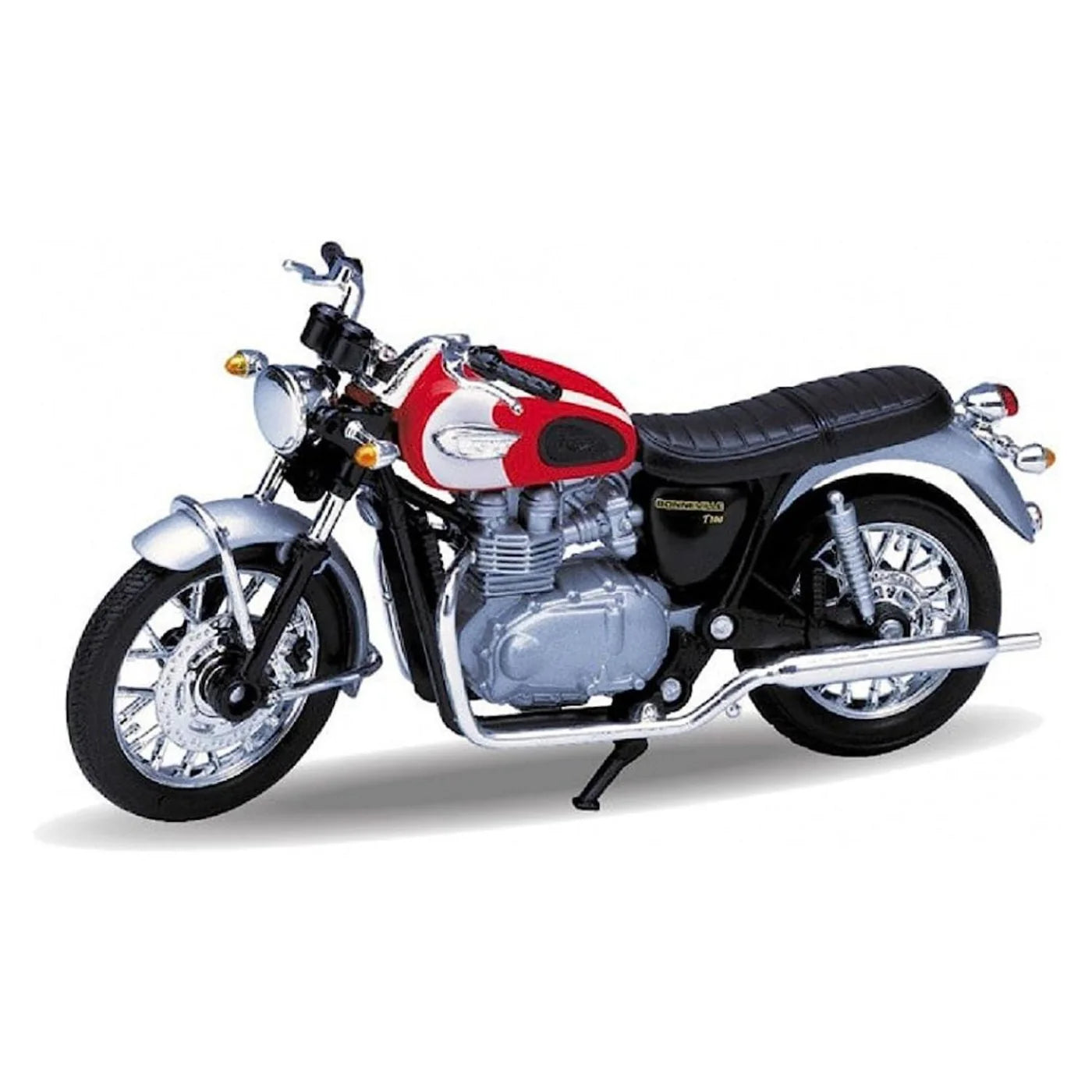 Constructed from high-quality die-cast metal, the toy motorcycle is built to be durable and visually appealing. It is designed at a 1/18th scale, which means it is approximately 1/18th the size of the real Triumph Bonneville T100, making it a compact and collectible piece.