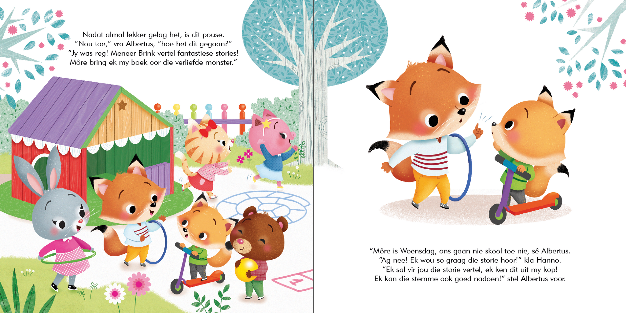Dis Hanno se eerste skooldag, en hy is ’n bietjie bang … Gelukkig is Albertus daar om hom gerus te stel en vir hom te vertel van al die lekker goed wat hy gaan leer. Hy gaan baie pret saam met sy nuwe maats hê!