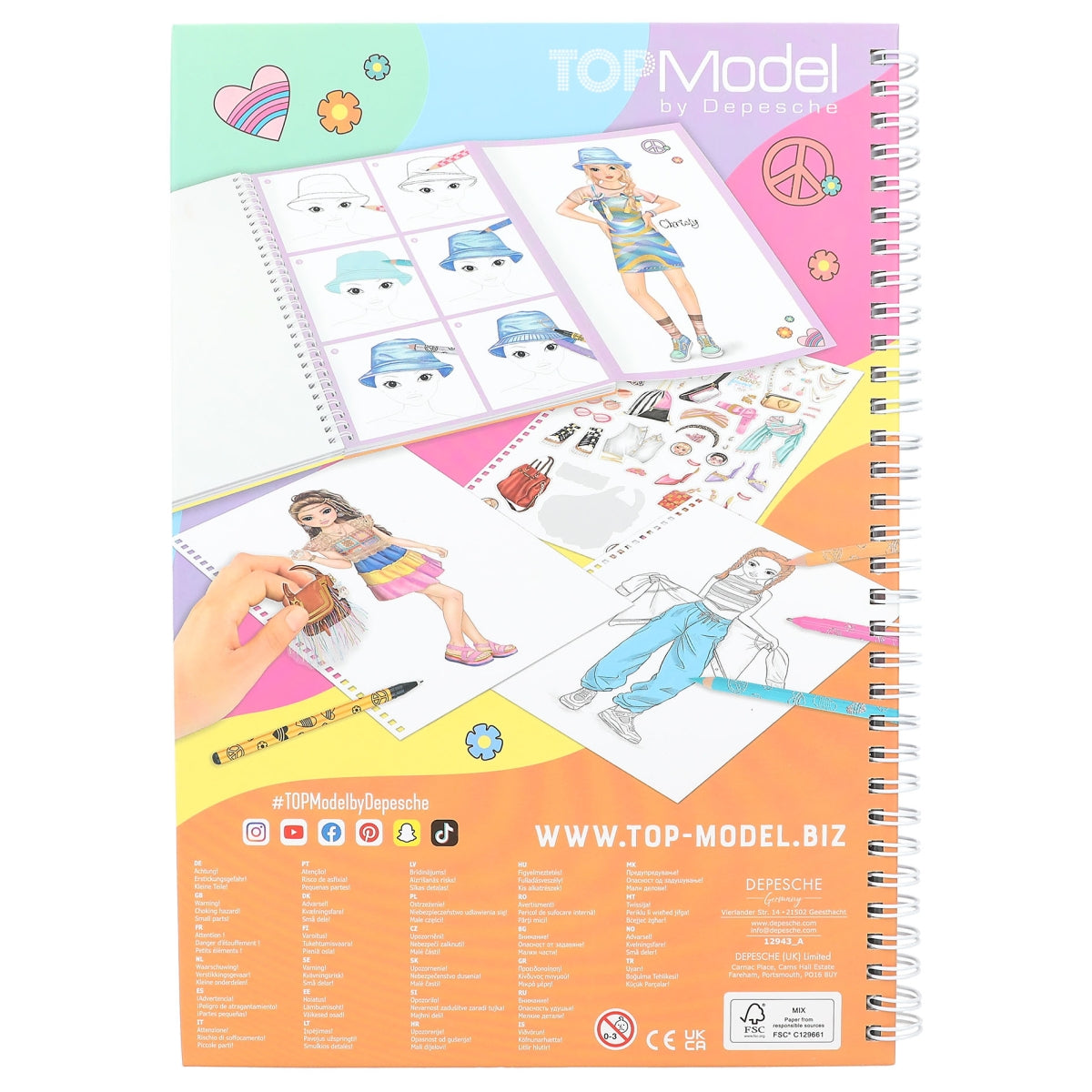 Ready for great looks: The colouring book set by TOPModel contains 76 colouring pages (partly pre-printed in colour), 2 fold-out pages with colourful colouring templates, 2 sticker sheets as well as essential pens for designing (10 colouring pencils, 4 gel pens (gold, silver, pink, purple), 1 eraser pen).