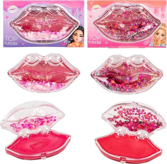 Glossy genius: the TOPModel lip gloss in a transparent box in the shape of lips with fun liquid with confetti gives the mouth a pink and lilac look.
